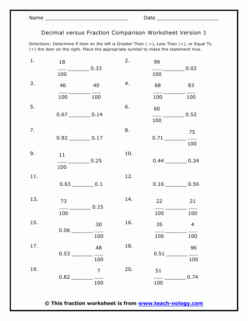 More Collection of Decimal Versus Fraction Comparison Worksheet Version 1