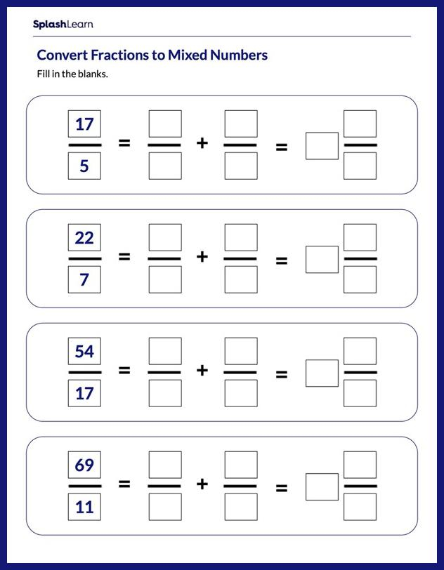 Decompose Fractions To Mixed Numbers Math Worksheets SplashLearn is a free printable for you. This printable was uploaded at August 24, 2023 by tamble in Mixed.