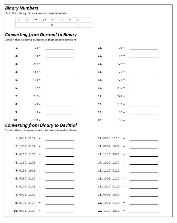 Binary Numbers Worksheet Answers – Innovative supplement drills are excellent ways to introduce students to algebra concepts. These drills have alternatives for 1-moment, a few-minute, and five-moment drills with personalized can vary of fifteen to 100 difficulties. In addition, the drills can be found in a side to side file format, with numbers from to 99. These drills can be personalized to each student’s ability level. That is the best part. Below are a few additional sophisticated supplement drills:
