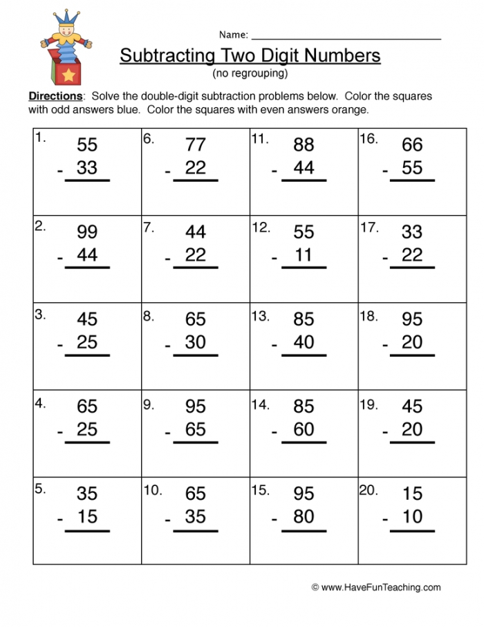 A Subtraction of two numbers worksheet is a great tool for teaching individuals concerning this basic math concepts idea. A two-digit amount can have two numbers then one decimal place. The students are taught to approach each place individually, rather than borrowing from the decimal place before. It helps to provide tactile and visual understanding of each place before they begin the subtraction of two digits. This particular worksheet works extremely well by students from year a person to 12 months about three.
