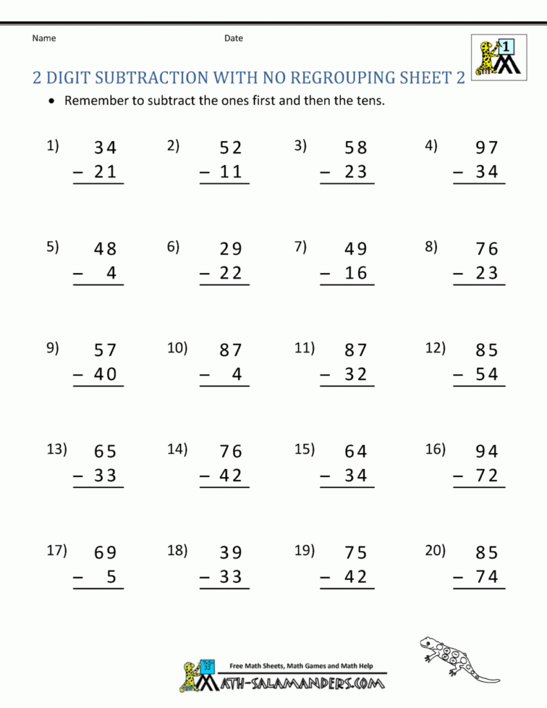 Subtraction Of 2 Digit Numbers Without Regrouping Worksheets – A Subtraction Numbers Worksheet is a helpful instrument for training and tests your child’s subtraction details. Subtraction worksheets should target the student’s subtraction details and never on the link between addition and subtraction. If you want to use these worksheets with your child, here are some tips you should keep in mind. Make use of a worksheet that can help your youngster be aware of the concept of each and every variety along with the strategy used to carry out subtraction. Subtraction Of 2 Digit Numbers Without Regrouping Worksheets.