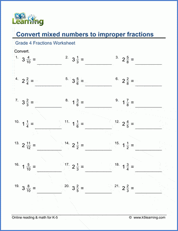 Convert Mixed Numbers To Improper Fractions Worksheets K5 Learning